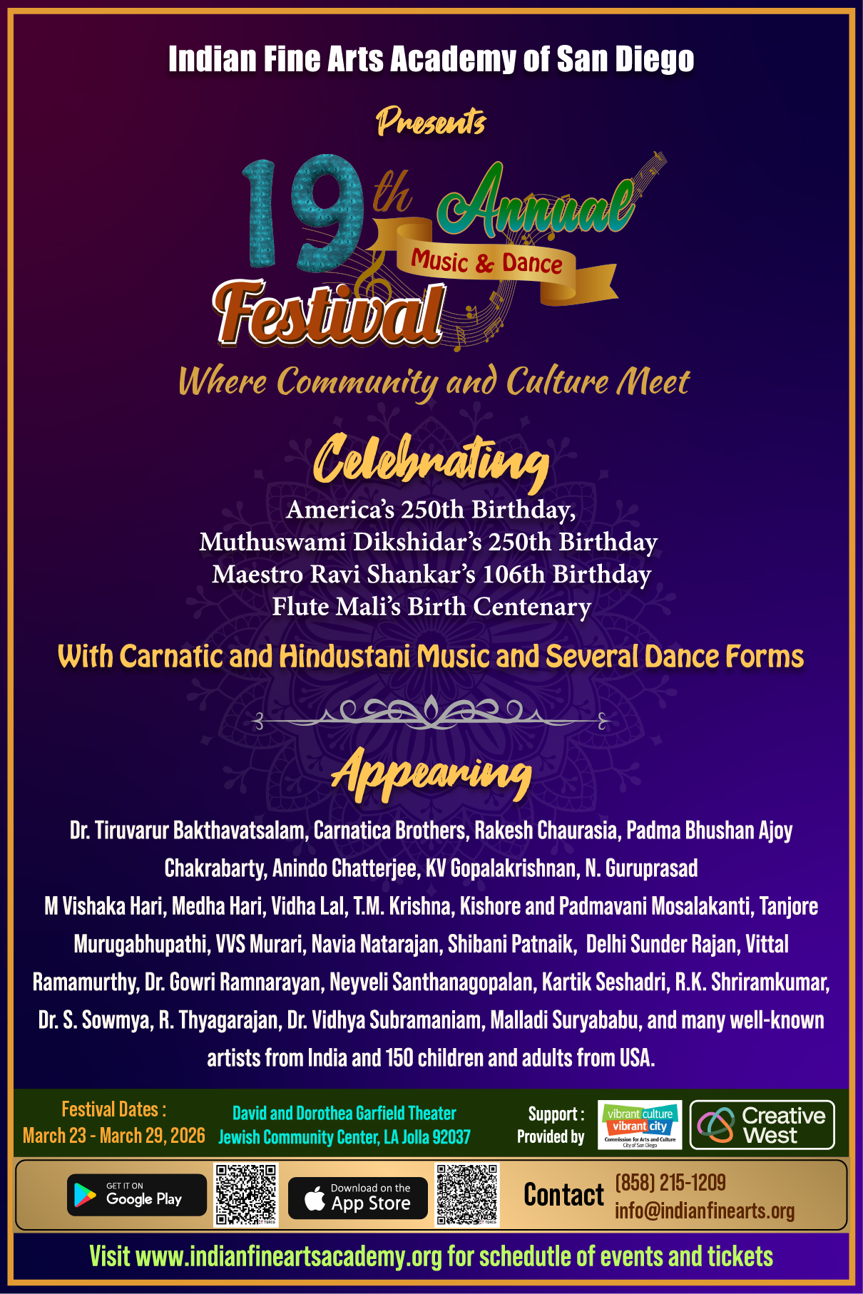 - A Global Celebration: Over 50 artists, including talent from India, and USA, will come together to share their artistry. Plus, more than 120 talented children from San Diego will add their energy and passion to the stage.